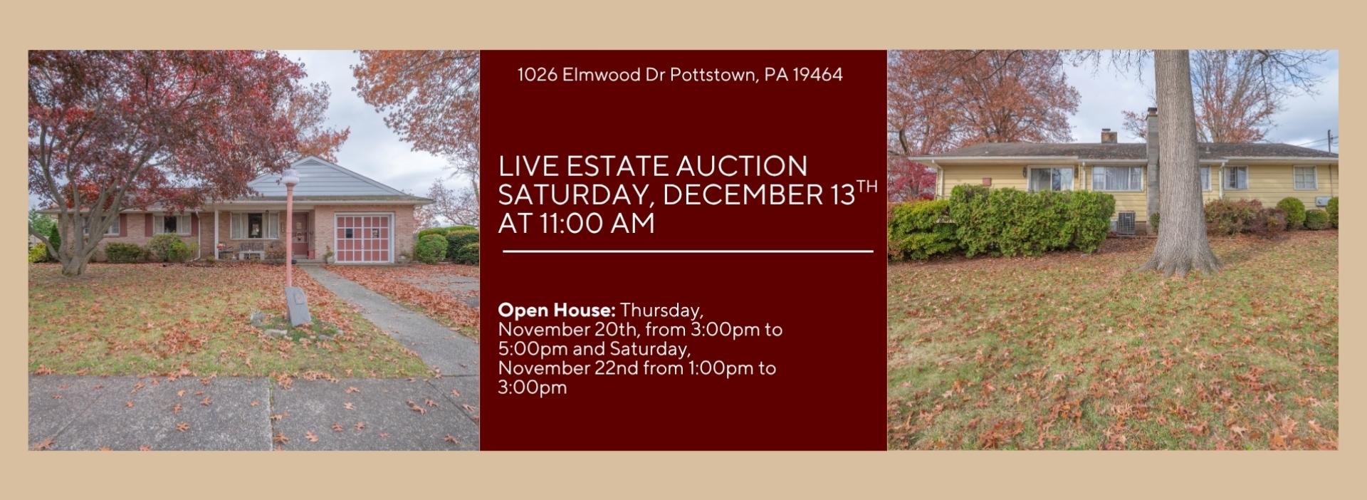 Location: 1026 Elmwood Dr Pottstown, PA 19464 Open House: Thursday, November 20th, from 3:00pm to 5:00pm and Saturday, November 22nd from 1:00pm to 3:00pm Live Real Estate Auction will be held on Saturday, December 6th at 11:00am